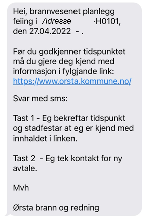 Varsel om tilsyn vert sendt per SMS. Om du ikkje kan varslast på denne måten vil feiar kontakt deg eller varsle deg med lapp på døra. Det er viktig å følgje instruksjonane som står i meldinga.